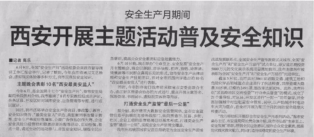(一)6月11日《西安日报》A10版、6月10日《西安晚报》A2版均报道了安全生产月期间西安开展主题活动普及安全知识相关内容。