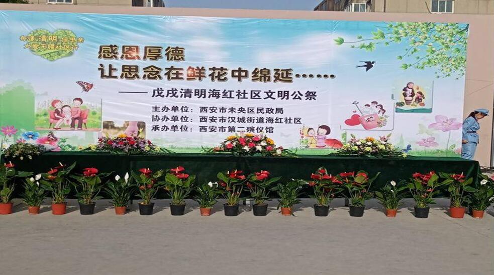 海红物业公司与海红社区携手西安市第二殡仪馆在海红小区文体广场开展以“感恩厚德、让思念在鲜花中绵延”为主题的绿色公祭活动。未央区民政局、汉城街道办、西安市第二殡仪馆的相关领导,海红物业公司、海红社区职工群众600余人参加了此次公祭活动。